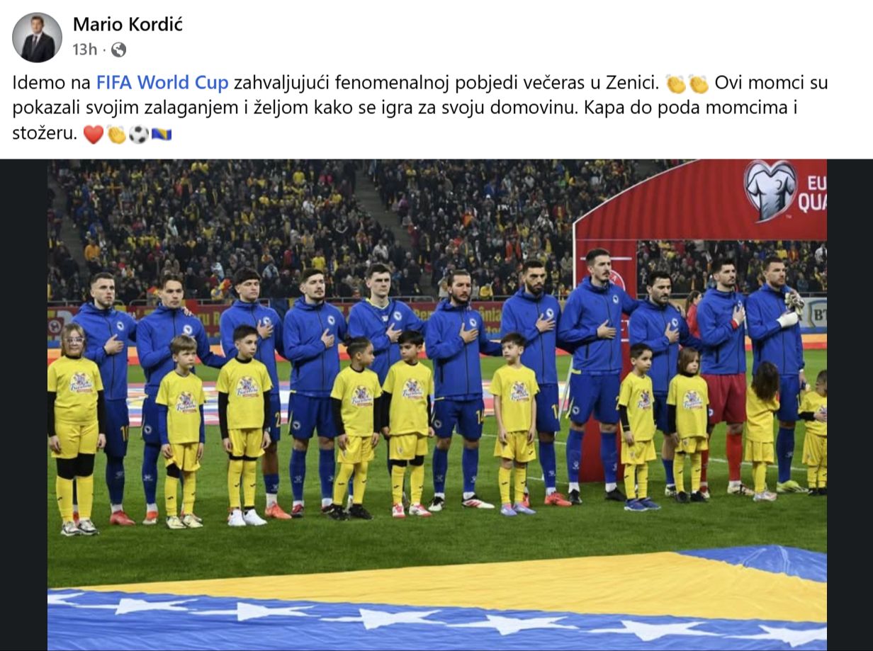 Čestitke našim momcima pristižu sa svih strana, a među onima koji su čestitali Zmajevima je i gradonačelnik Mostara Mario Kordić. On je na Facebook-u napisao kako idemo na Svjetsko prvenstvo zahvaljujući fenomenalnoj pobjedi u Zenici.