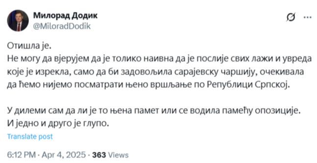 Dodik je prvo nazvao nepoželjnom i pozvao MUP RS da je “isprati” iz Banje Luke.