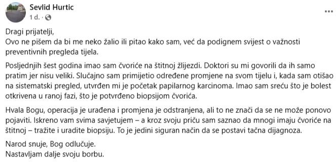 – Dragi prijatelji, ovo ne pišem da bi me neko žalio ili pitao kako sam, već da podignem svijest o važnosti preventivnih pregleda tijela. Posljednjih šest godina imao sam čvoriće na štitnoj žlijezdi. Doktori su mi govorili da ih samo pratim jer nisu veliki. Slučajno sam primijetio određene promjene na svom tijelu i, kada sam otišao na sistematski pregled, utvrđen mi je početak papilarnog karcinoma – navodi Hurtić.