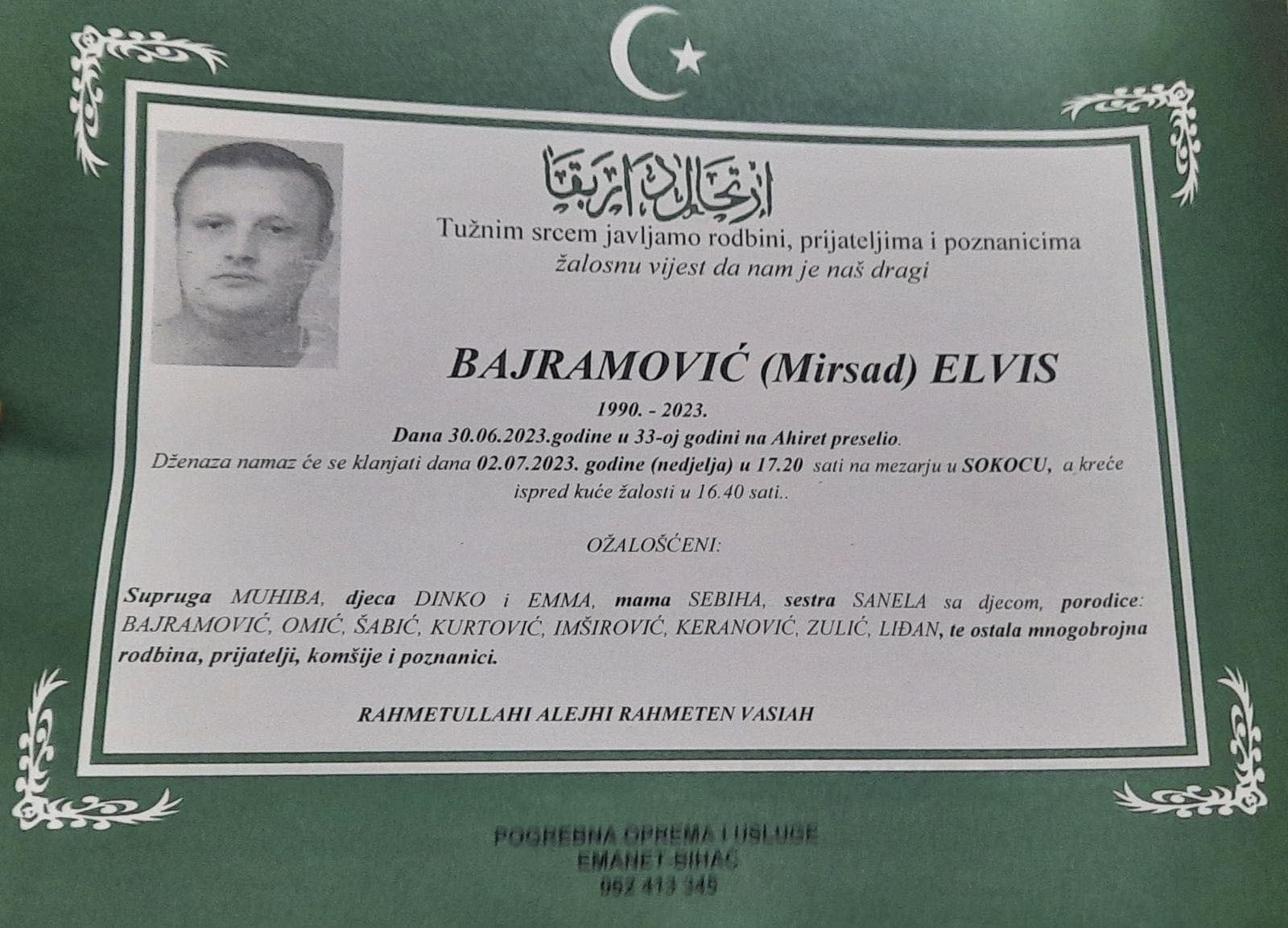 Dženaza ubijenom Elvisu Bajramoviću klanjat će se sutra 2. jula u 17:20 sati na mezarju u Sokocu, a kreće ispred kuće žalosti u 16.40 sati.