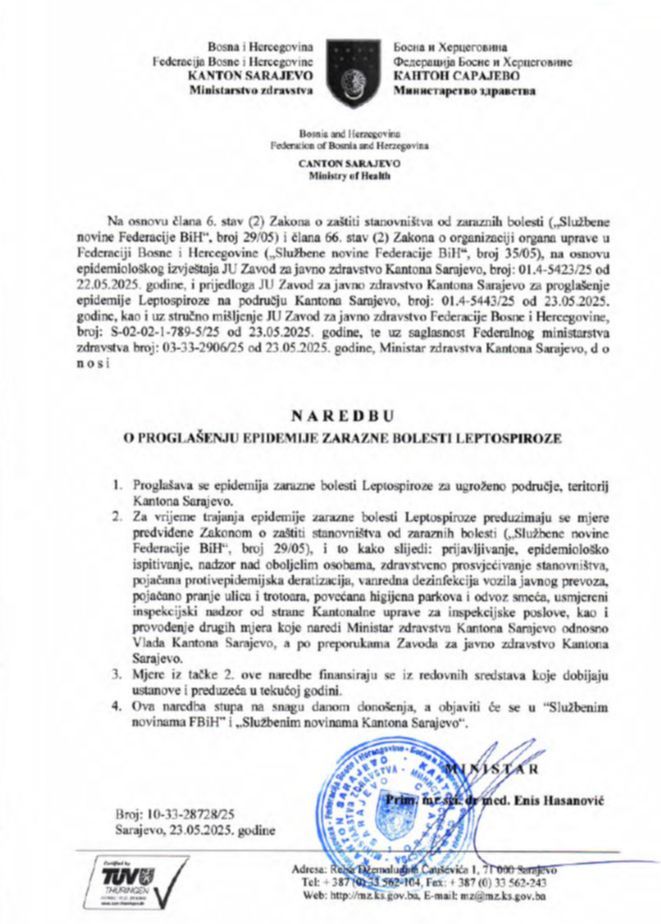– Proglašava se epidemija zarazne bolesti Leptospiroze za ugroženo područje, teritoriju Kantona Sarajevo.